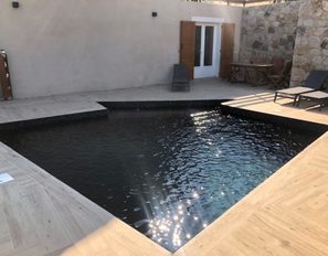 Au rez de chaussée un séjour de 60m² avec cuisine ouverte entièrement équipée, une chambre avec salle d'eau (accès indépendant), une buanderie. Une grande terrasse de 65m² avec douche extérieur et bains de soleil autour d'une piscine privative de 4x5 m et un terrain de boules (barbecue à disposition)