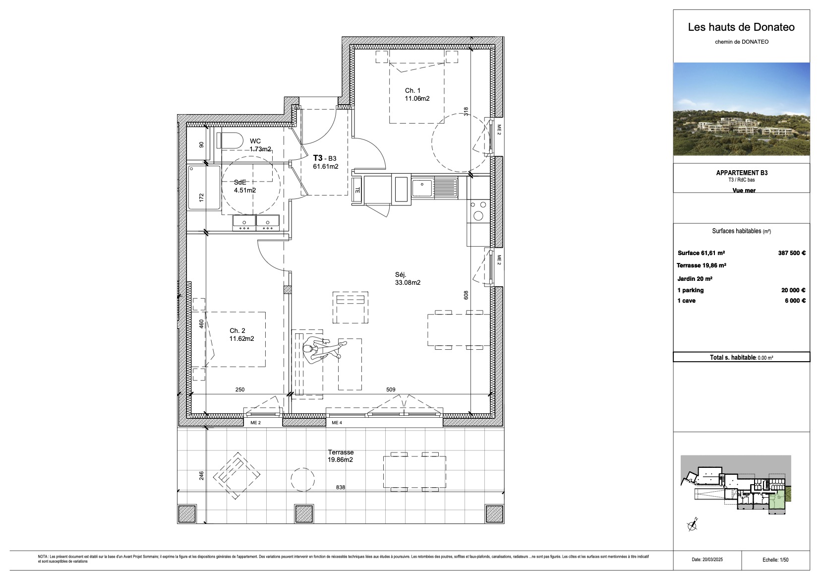 Ce T3 (lot 3) est composé d'un espace séjour avec cuisine ouverte, d'une chambre et d'une salle d'eau avec wc. Les 2 pièces principales ouvrent sur une terrasse de 19,5 m² et un jardin de 20 m² avec une magnifique vue mer. Possibilité d'acquérir un emplacement de parking souterrain (20 000 euros)