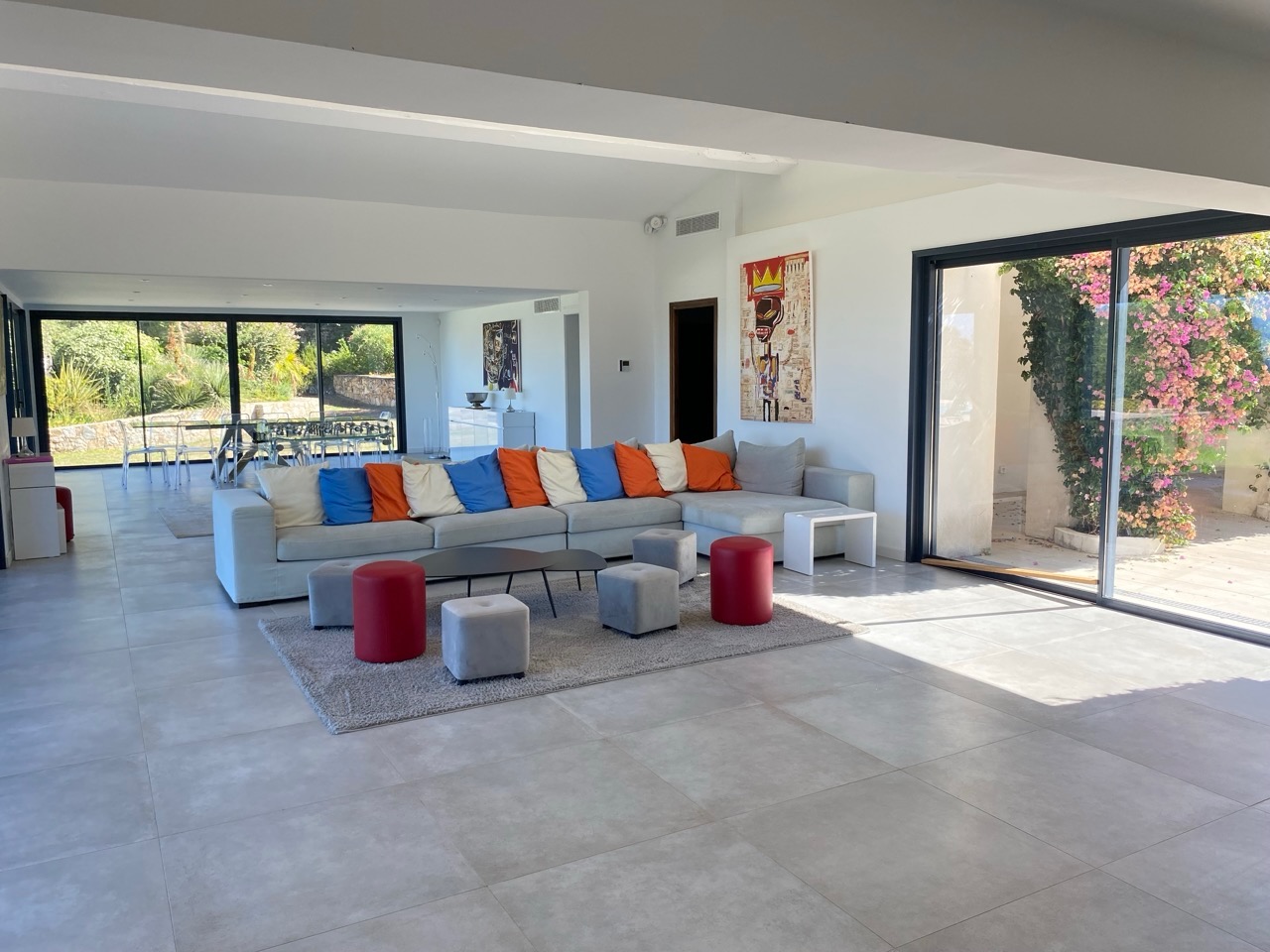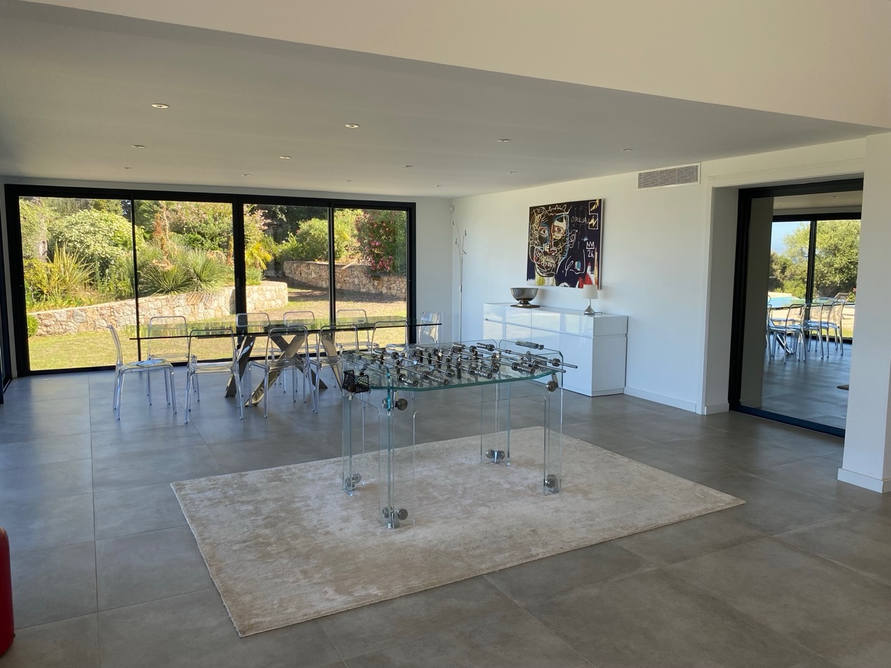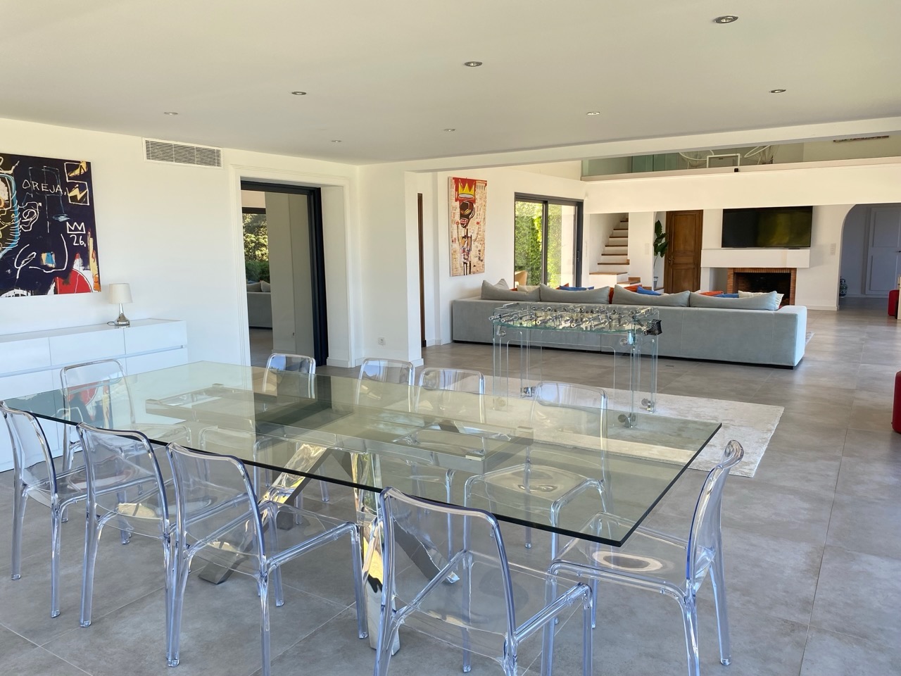 L’architecture ouverte de la villa privilégie la lumière et la transparence, avec une vaste pièce de vie baignée de lumière accueille un élégant salon et une salle à manger ouvrant sur l’extérieur, dans une parfaite harmonie dedans/dehors. Une cuisine professionnelle, prolongée d’une arrière-cuisine discrète.