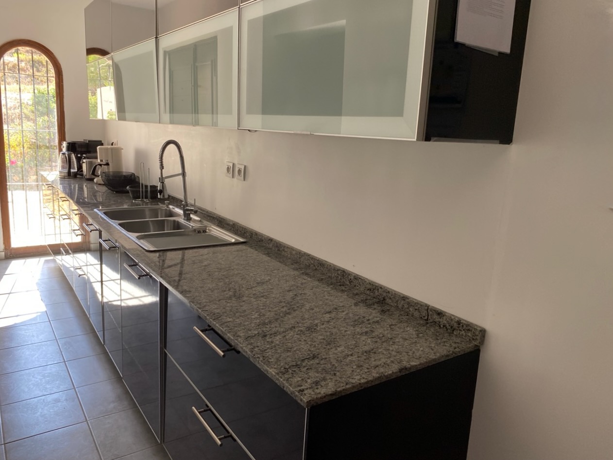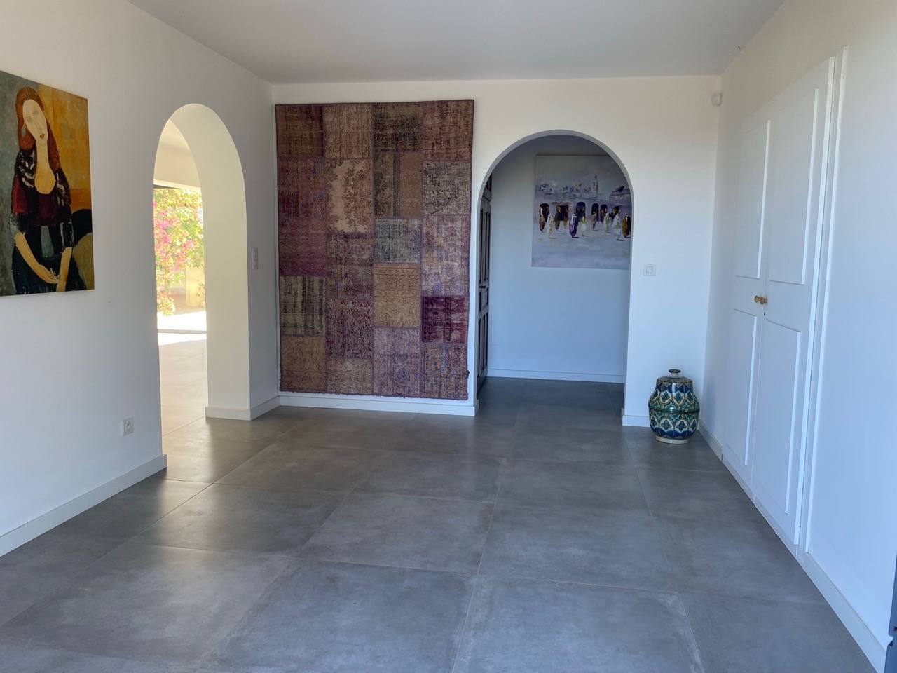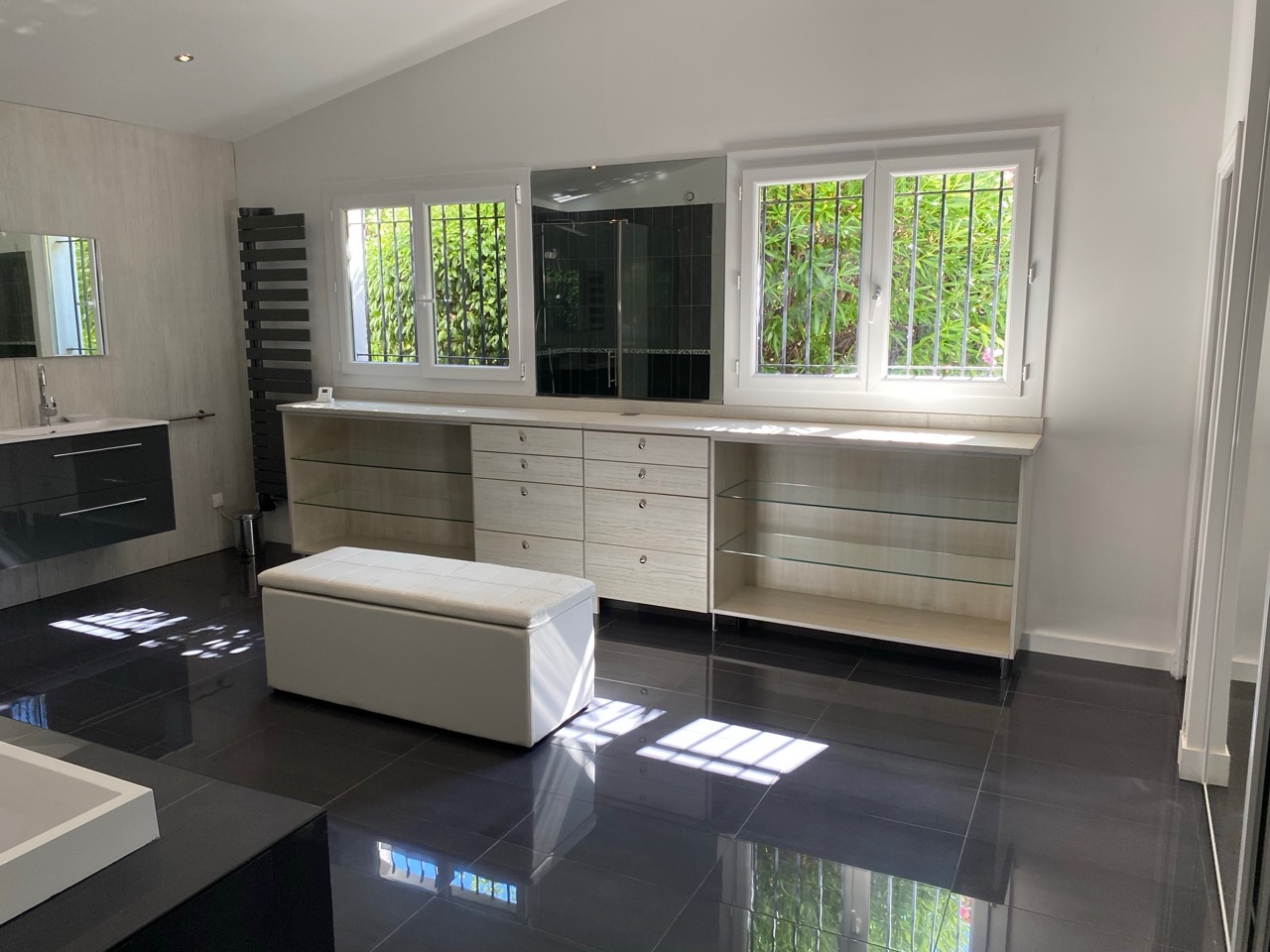 L’architecture ouverte de la villa privilégie la lumière et la transparence, avec une vaste pièce de vie baignée de lumière accueille un élégant salon et une salle à manger ouvrant sur l’extérieur, dans une parfaite harmonie dedans/dehors. Une cuisine professionnelle, prolongée d’une arrière-cuisine discrète.